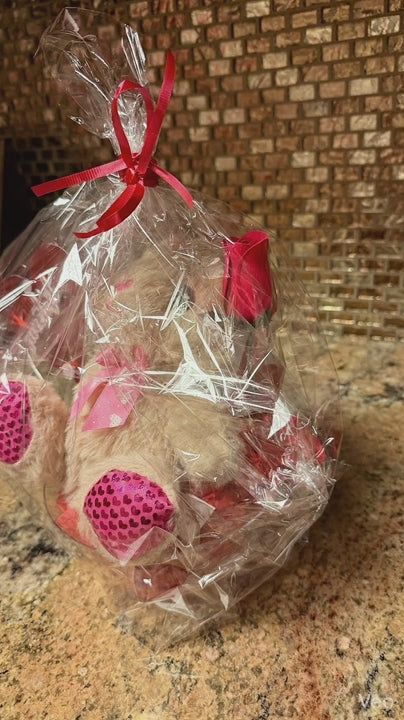 a light-beige, furry teddy bear measuring 6 1/2" (seated) in a "basket" (a clear, acrylic reusable bowl), holding a big shiny-red cardstock-heart that reads: "sweetest" in its right hand and a red artificial rose in its left hand. At its back is a red "Happy Valentine's Day" box of solid chocolate.